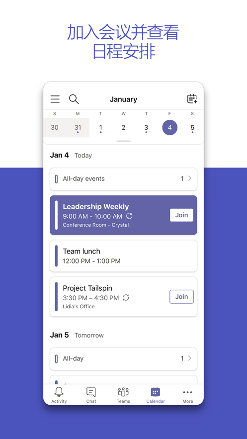 并从几乎任何位置加入会议* 进行私人或群组聊天,