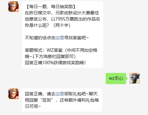 2 、元歌玩家们在3天投票期内 ,皮肤票胜因此王者荣耀4月1日每日一题答案就是设计“wz无心” ,